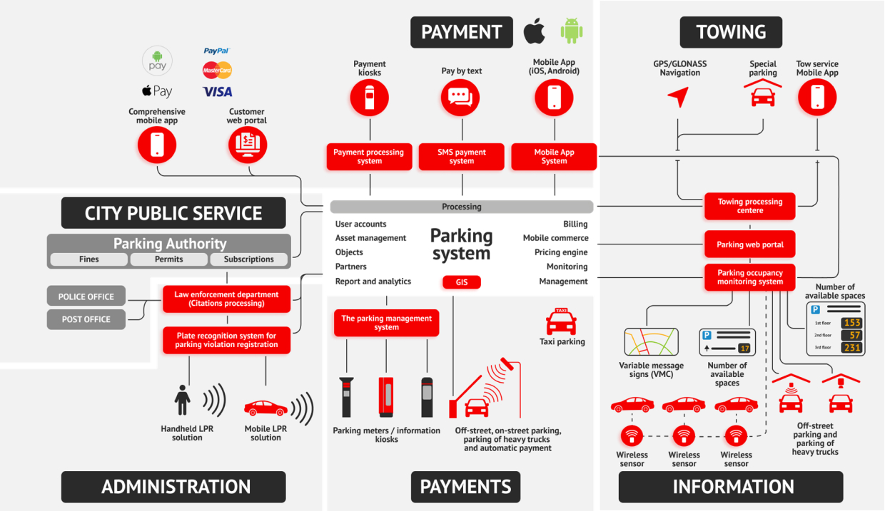 ihlallerin ve cezaların yönetimi, otomatik plaka tanıma işleviyle ücretli park yeri kontrolü için özel bir mobil uygulama, QR kodlarını okuma, RFID / UHF etiketleri, arabaları tanımlamak için Bluetooth etiketleri